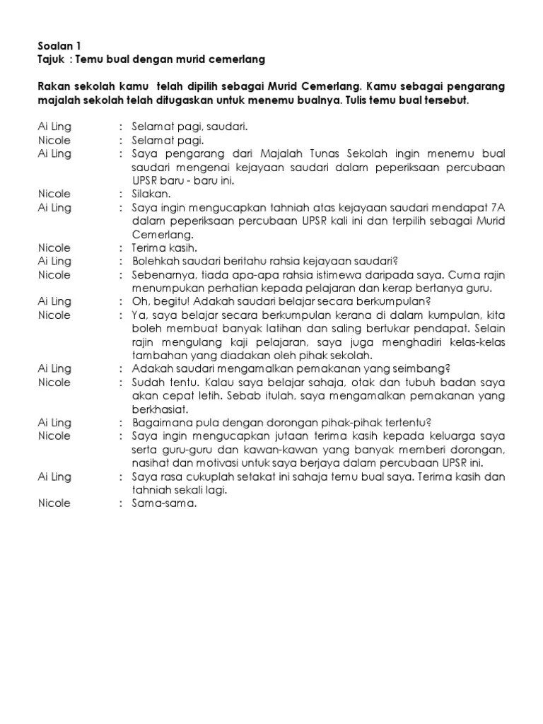 Kami berharap agar blog ini nanti boleh menjadi . Lakonkan sesi temu ramah di bawah dengan. For more information and source see on this link. Kamu dikehendaki menemu ramah seorang tokoh sukan di sekolah kamu . Contoh skrip temu bual kerja kursus sejarah. Contoh karangan dialog pt3 spm bahasa melayu yang terbaik yang dihasilkan oleh pelajar sekolah, boleh jadi rujukan untuk menulis. Dialog / temuramah soalan : Contoh esei temu bual adakah anda merancang untuk menulis karangan temu bual?